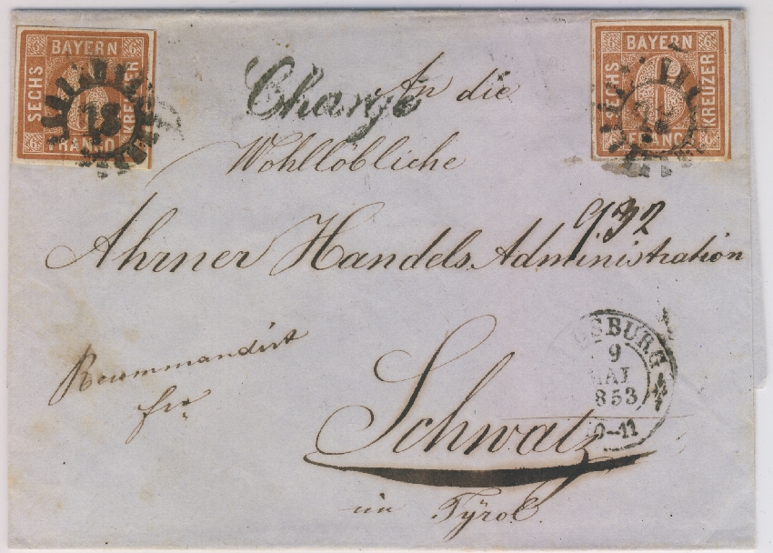 entweder es war so, wie der gute Nils es schrieb (müsste ich mal nachrechnen), oder aber es trifft meine Vermutung zu, dass man von Augsburg aus über die Schweiz nach Tirol frankieren wollte, wodurch 9 Kr. für Bayern und 3 Kr. für den Transit durch die Schweiz die verklebten 12 Kr. ergäben. Der Leitweg über die CH war üblich von Augsburg aus und musste nicht nominiert werden (allein das Franko bestimmte die Leitung).