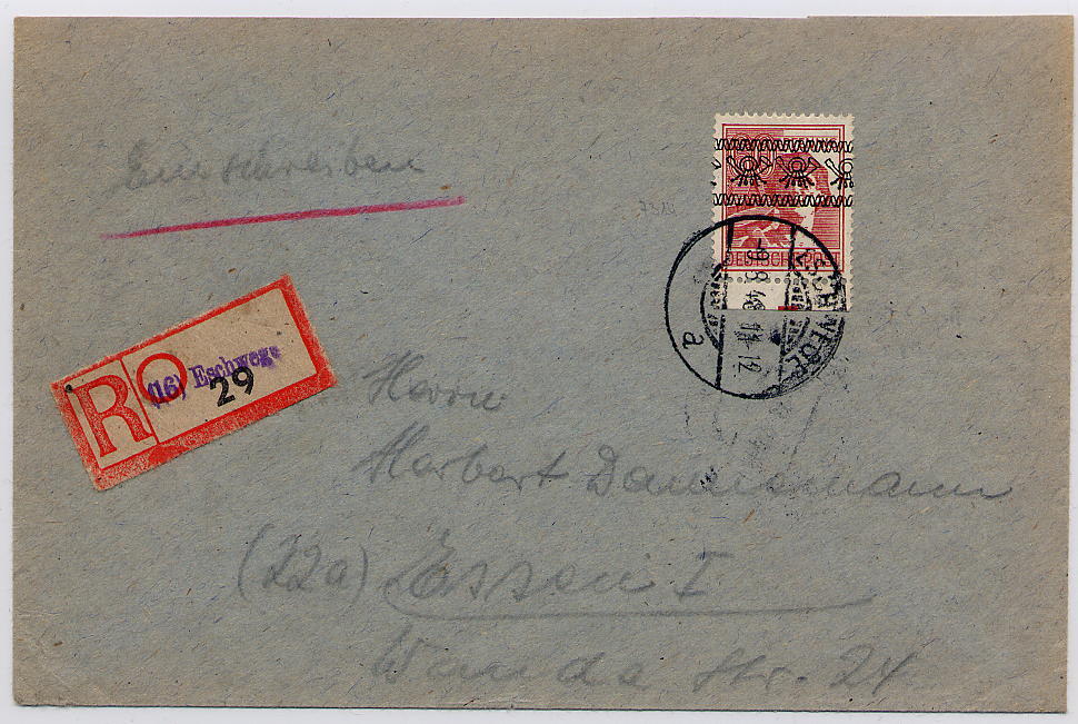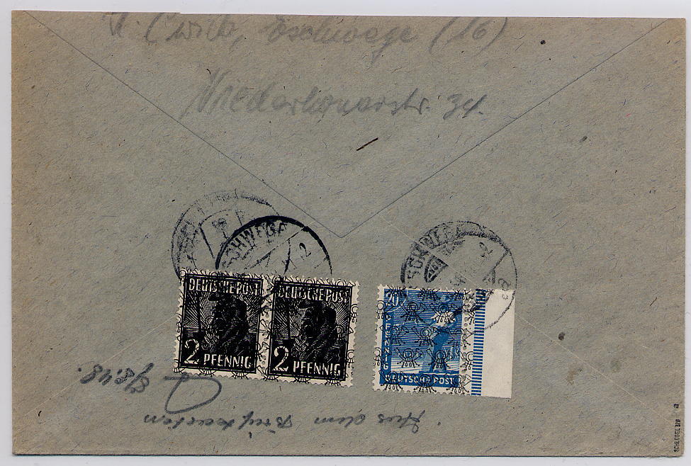 Und gleich noch einen besonderen 10-fach Beleg, den ich erst kürzlich von der Farbprüfung zurück bekam. Es handelt sich um einen einfachen Fernbrief und ein Teil der Marken wurden auf der Rückseite angebracht. Er wurde am 21.6.48-20Uhr abgestempelt. Aber dieser Beleg hat es in sich, denn er wurde vorderseitg mit 7 Marken der Mi-Nr. 946b frankiert.