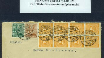 Frankiert ist der Brief mit Kontrollratsmarken für insgesamt 6,72 RM und einer 10 Pf - Marke in neuer Währung (Aufdruck mit Posthörnchennetzüberdruck). Demnach ist der Beleg mit 1,2 Pf neuer Währung überfrankiert.