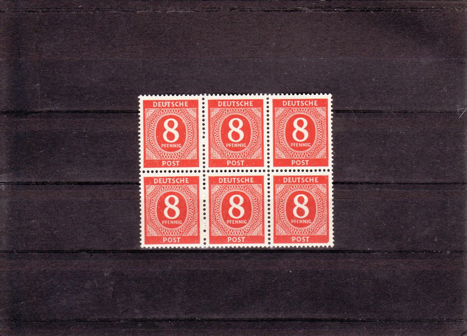 Bei dem Sechserblock der 8 Pf-Marken handelt es sich um die Mi.Nr. 917 I, "rechte untere Ecke abgebrochen".