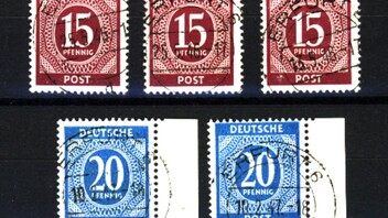 Die Urmarken sind Werte aus der zweiten Einheitsserie ("Arbeiterserie") des Alliierten Kontrollrates. Teilweise wurden für die Aufdruckmarken neue Urauflagen hergestellt. Deshalb stimmen die Farben nicht unbedingt mit denen der ursprünglichen Arbeiterserie überein.Die interessanten Marken sind die 20 Pf- Werte im senkrechten Paar in der beseren d - Farbe, natürlich farbbestimmt......