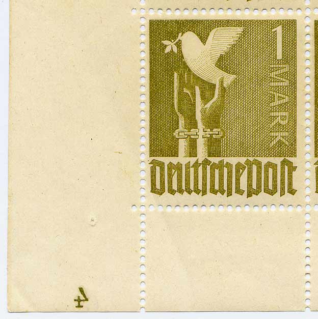 Also folgendes: Ich habe in einem Bogenlot eine 1 RM (Mi. 959 gefunden, die auf der linken unteren Ecke eine negative 4 aufweist. Im Michel steht dazu nichts, weder bei den Plattennummern noch bei Druckerzeichen ist dazu was geschrieben, jedenfalls keine 4. Wer kann hier helfen?