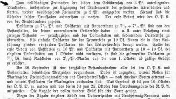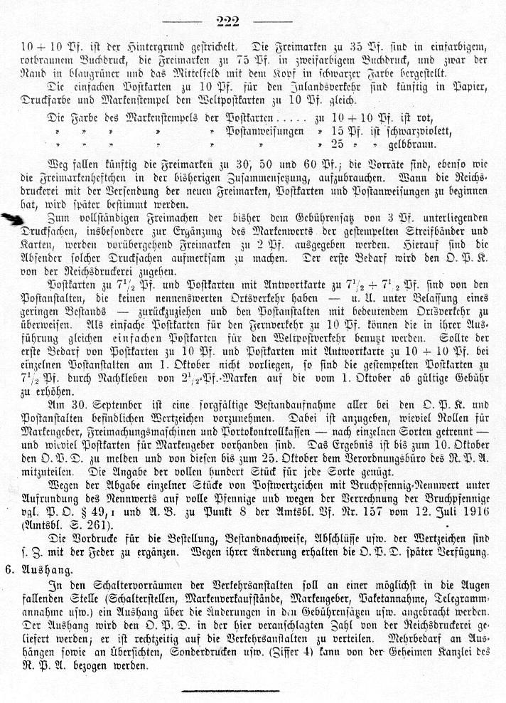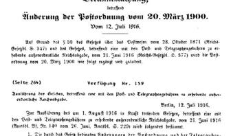 Auf Grund dieses Belegs hab ich mich mal genauer mit der am 1.8.1916 eingeführten Reichsabgabe beschäftigt. Wenn ich mir die Bekanntmachung vom 12 Juli 1916 durchlese wurde diese Abgabe auf alle Portopflichtigen Sendungen im Reichspostgebiet usw. erhoben, und zwar ab dem 1.8.1916. Wenn ich mir aber die Portotabellen im Michel Postgebührenkatalog anschaue blieb das Drucksachen Porto bis 50 g von 1875 bis zum 1.10.1918 gleich. Nun meine Frage. Wurde diese Abgabe auf Drucksachen erst am 1.10.1918 fällig ? Der von mir gezeigte Beleg vom 24.5.1919 wahr m.M. nach laut der unten gezeigten Verfügung (e) von der Reichsabgabe ausgeschlossen. Eine normale Drucksache aus dieser Portoperiode hätte vom 1.10.1918 bis 5.5.1920 5 Pfennig gekostet.