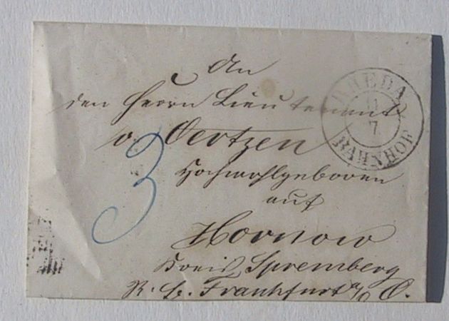 Ich möcte hier einen Brief vorstellen, der einen langen Weg innerhalb von Preussen genommen hatte. Das Jahr kann ich nicht feststellen, aber es sollte aber das 2 Halbjahr im Breich 1800 sein. Auf der Rückseite sind 3 Bahnpoststempel. Der Brief lief am 11.07. von Rheda Bahnhof nach Hornow bei Spremberg an Herrn Leutnant von Oertzen. Die Bahnpoststempel sind Deutz-Minden, Minden-Berlin und Berlin-Breslau. Ich habe nun in der IEG-Maps nachgesehen, ob es 1850 bereits die Bahnverbindung für die 3 Stempel gab. Das ist der Fall.