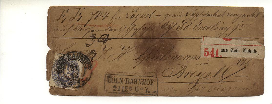 Und weil 2 Paketbegleitbriefe schön sind, 3 aber noch schöner, deshalb hier noch einer - diesmal von Crefeld Bahnhof nach Breyell von 2.3.1867 mit 2 x Mi.Nr. 16.