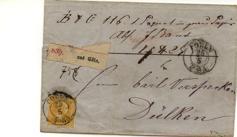Der davor gezeigte von Köln nach Breyell dürfte über 5 jedoch unter 10 Meilen sein. Das Paket wog nur 3 Pfund und somit wurde hier ebenfalls die Mindesttaxe angewandt.