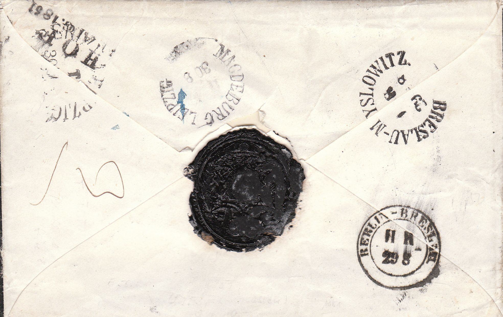 Wie man der Siegelseite entnehmen kann, lief er per pr. Bahnpost über Sachsen und Hof nach Württemberg, wo er am 1.9.1851, dem Beitrittstag Württembergs zum Postverein, eingetroffen sein dürfte.