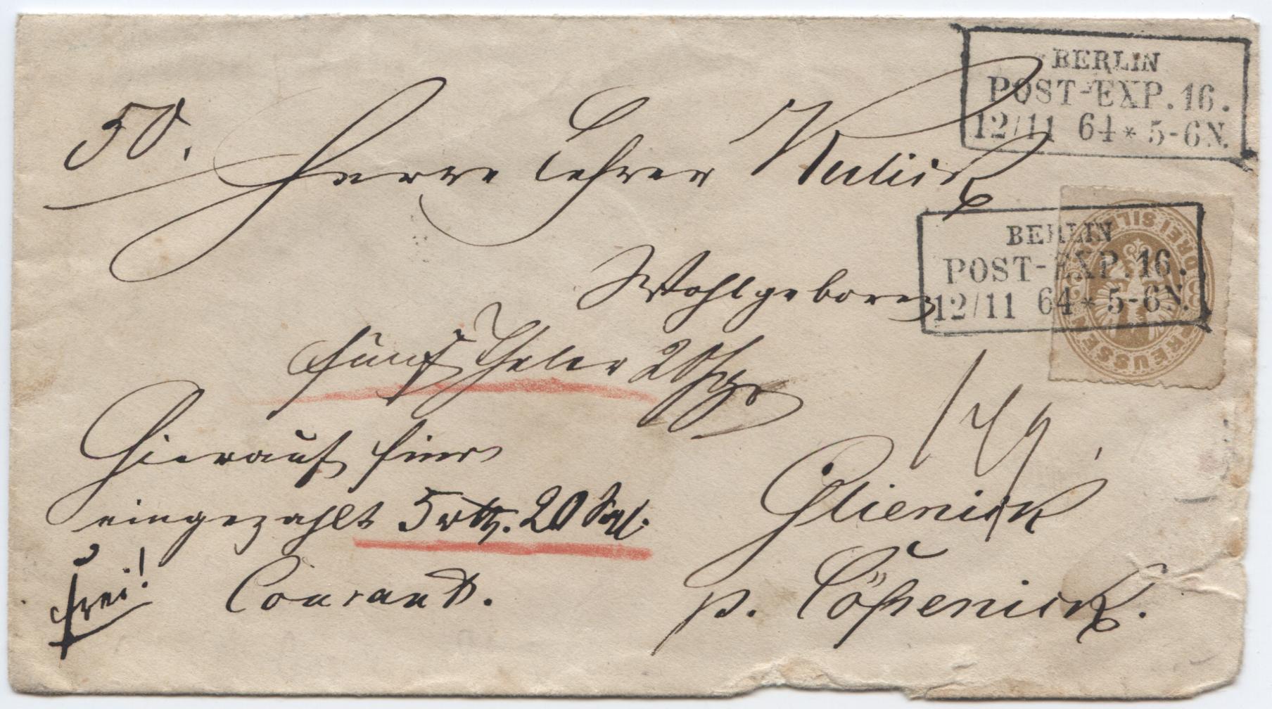 habe hier eine Postanweisung von 1864 frankiert mit 3 Silbergroschen von der Postexp. 16 nach Glienick bei Cöpenick zugehörig zur OPD Potsdam ( seit 1920 zugehörig zu Berlin ).