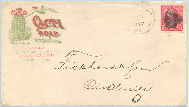 Auch hier ist leider die Adessenangabe unzureichend, was auf eine Gefälligkeitsabstempelung hindeutet, obwohl der Brief mit Datum vom 7.10.1897 ist. Werbeaufdruck mit Echinomastus.