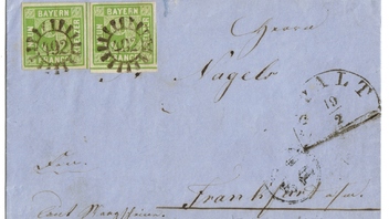 Postvereins-Doppelbrief aus Spalt nach Frankfurt, 3. Rayon über 20 Meilen und Gewicht zwischen 1 und 2 Loth korrekt mit 2x MiNr 5d frankiert und mit gMR 492 entwertet.