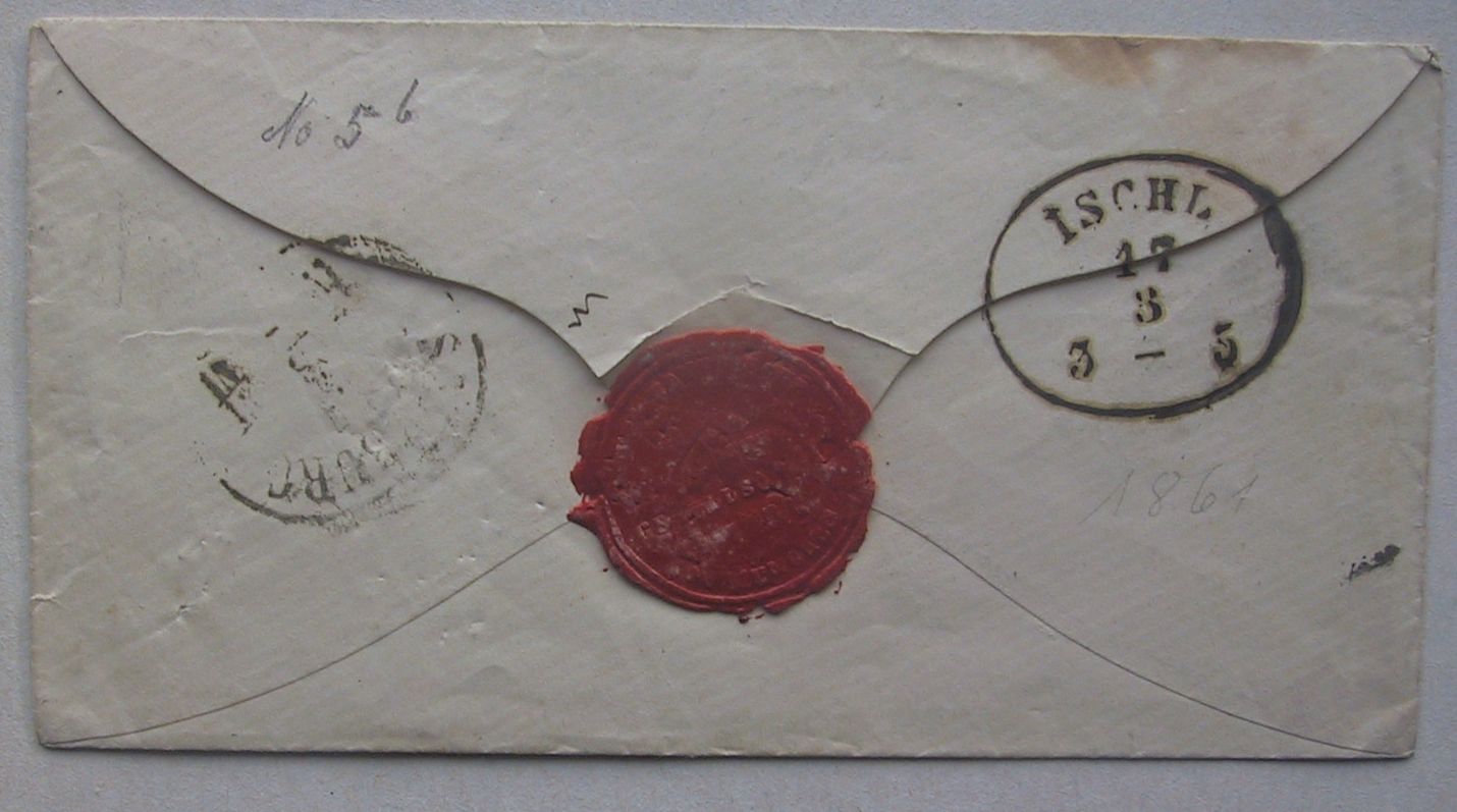 Ich möchte hier einen Brief aus dem Jahr 1861 mit einer 9 Kr. grün Marke Typ d vorstellen. Der ist von München nach Fischl im Salzkammergut gelaufen. Auf der Rückseite sind Stempel von Salzburg und Ischl. Die Marke hat eine weitere Besonderheit: Ich meine, am linken Rand sieht es nach einer überdruckten Papierfalte aus.