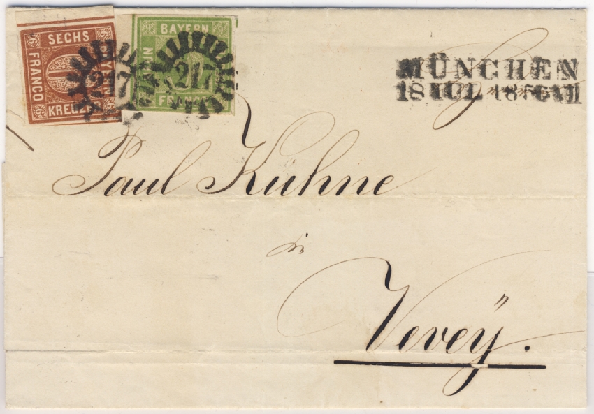 9 Kreuzer grün zusammen mit 6 Kreuzer braun (beide vom linken Bogenrand !) als 15 Kreuzer-Frankatur (9 für Bayern - 6 für die Schweiz) von München 18. Juli 1856 nach Vevey.