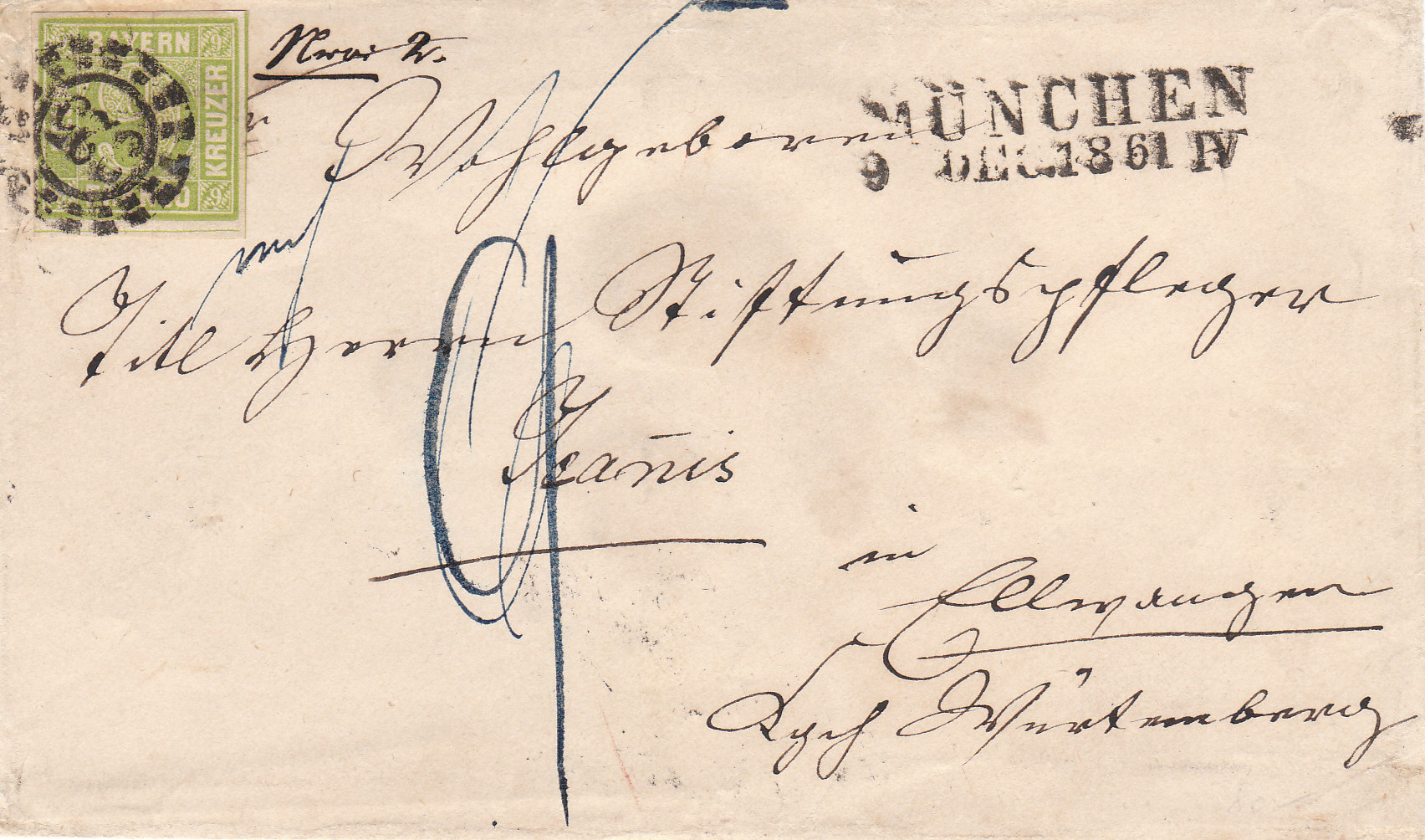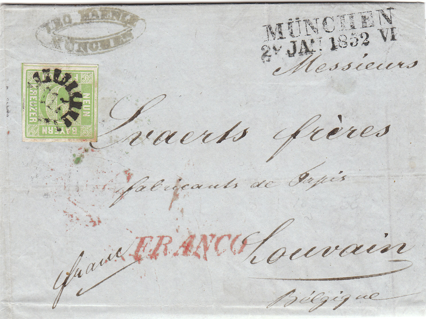 Ein kleines Highlight der 9 Kr. Briefe zeige ich mal hier: Er stammt aus München vom 29. Januar 1852 und lief nach Louvain. Was ist an dem denn besonderes?