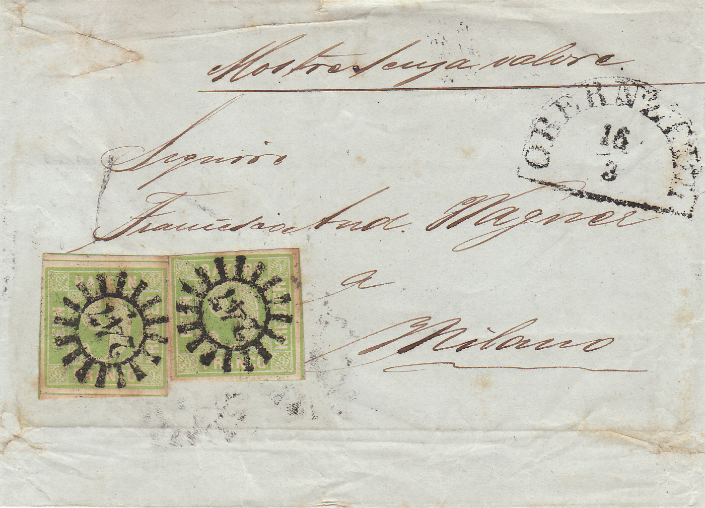 Richtig erkannt wurde auch Milano = Mailand, also bis 1859 zur Lombardei und damit zum Kaiserreich Österreich gehörend. Damit war es ein Postvereinsbrief, kein Auslandsbrief!