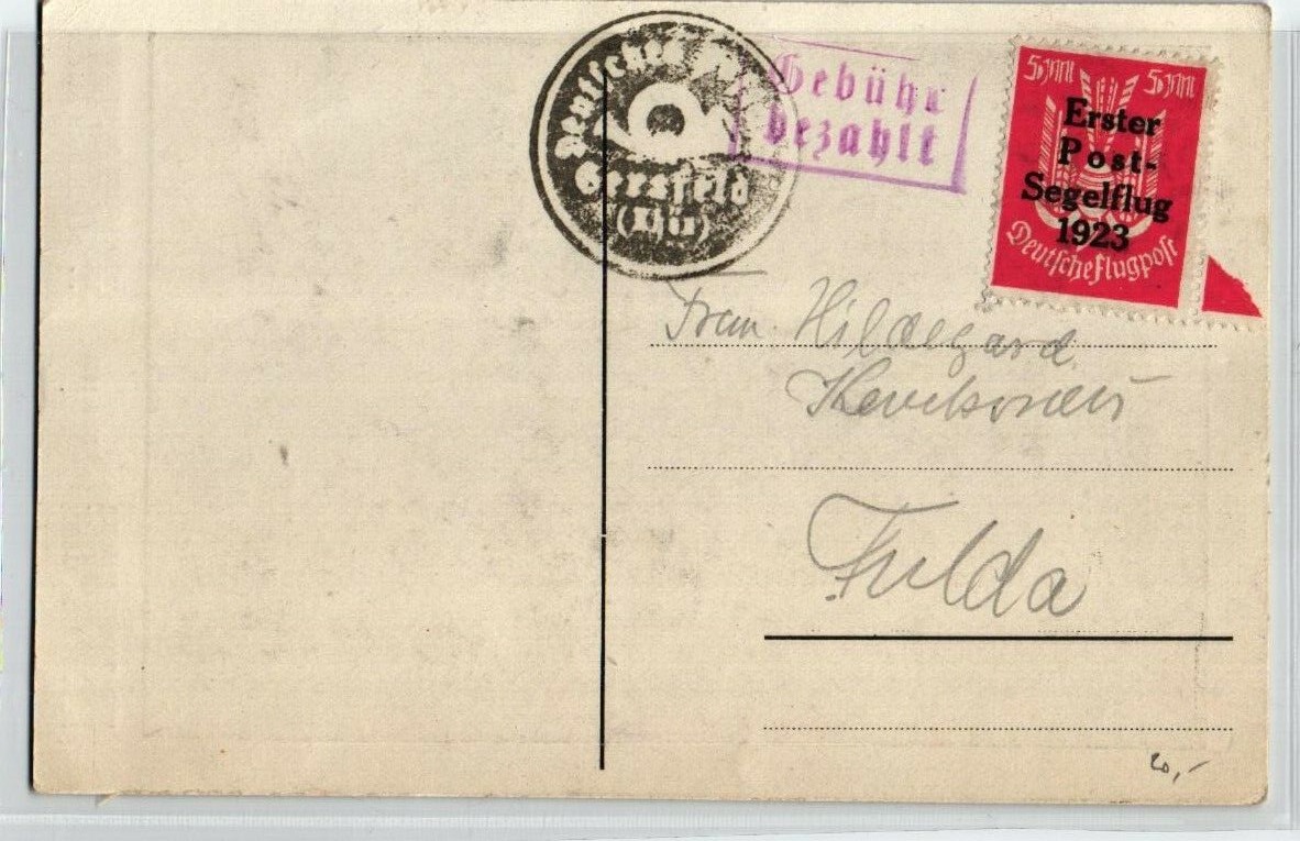 Eine Flugpost-Marke Deutsches Reich (vermutlich Mi.-Nr. 263 von 1922) mit Aufdruck: Erster Postsegelflug 1923. Ist der Überdruck rein privat oder ist das eine halbamtliche Flugmarke? Die Marke wurde nicht abgestempelt, links daneben ist ein Stempel: Deutsches Reich Gersfeld (Rhön) und ein Stempel: Gebühr bezahlt. Der Verkäufer bezeichnet die Marke als Vignette. Mal sehen, was die Karte bei einem Startpreis von 20,- EUR am Ende bringt?
