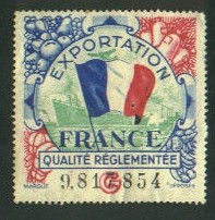 Die quadrat. Marke zeigt die Trikolore, im Hintergrund ist ein Schiff zu erkennen. Sie trägt die Aufschrift "Exportation" und "France", "Qualite Reglementee" sowie eine laufende (?) Nummer"9.817854". Die Marke ist ungestempelt, der Gummi fehlt jeoch. Auf der Rückseite befindet sich ein Erstfalz, das ist vielleicht ein Hinweis auf das Alter.