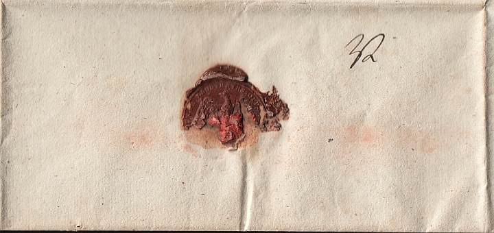 Hier die Rückseite des Briefes mit Land-Raths-Siegel und einer Zahl 32 (=?)