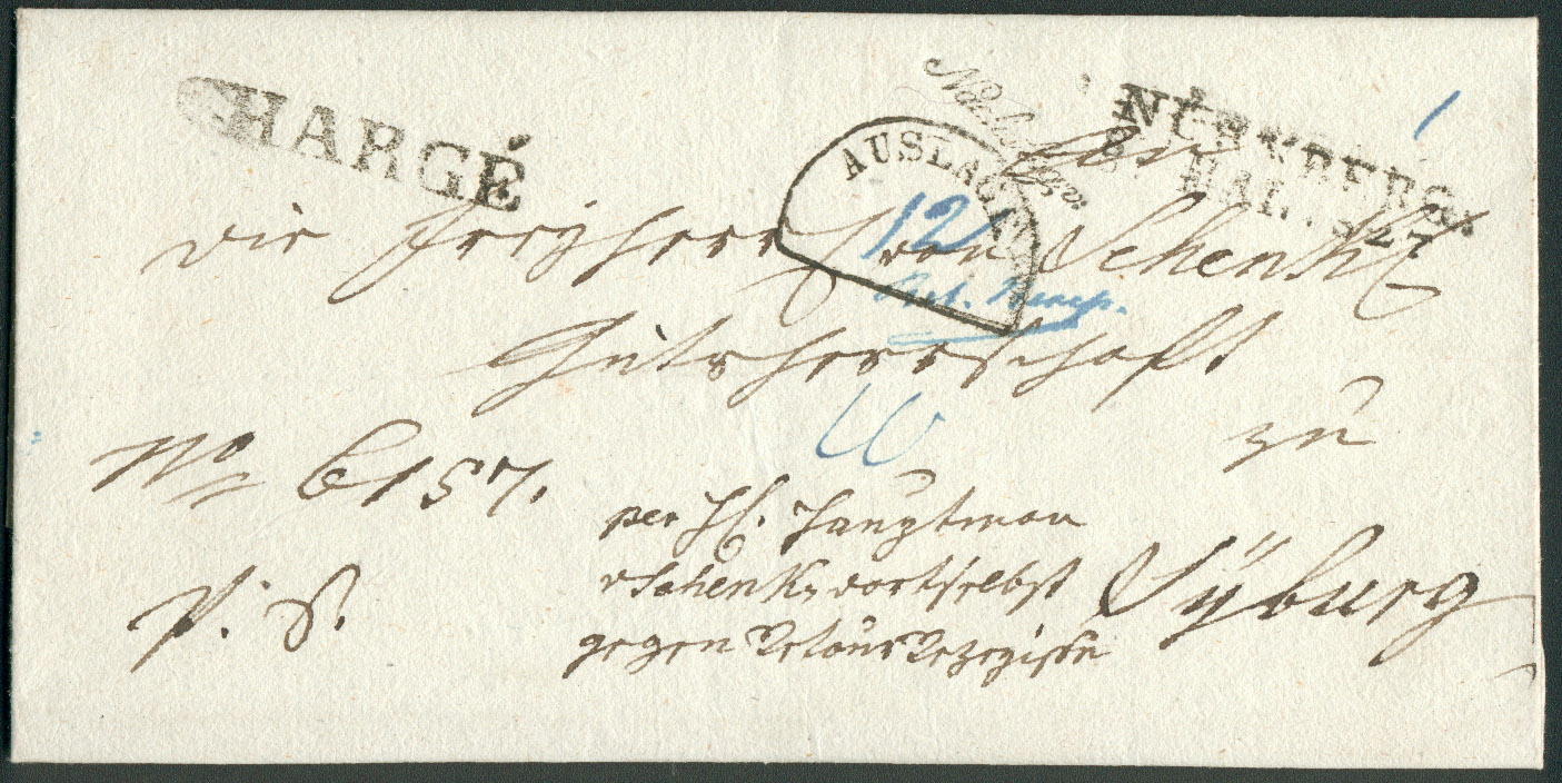 der Absender zahlte (s. Siegelseite) 6 Kr. für Bayern bis Grenze zu Taxis und weitere 30 Kr. für Taxis bis Hamburg.