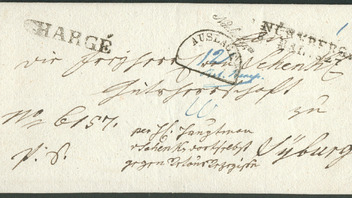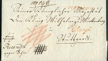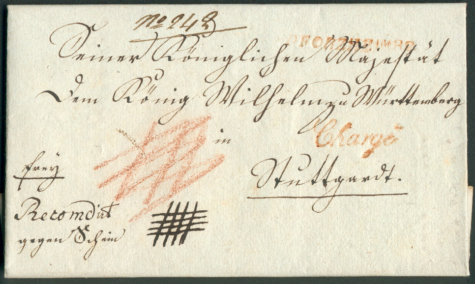 will einen Frankobrief mit Charge (Einschreiben) von Pfinzweiler (Württemberg) an König Wilhelm I von Württemberg vom 30. Sept. 1821 vorstellen. Der Frankobetrag ist jedoch weder auf der Vorder - oder Rückseite vermerkt.