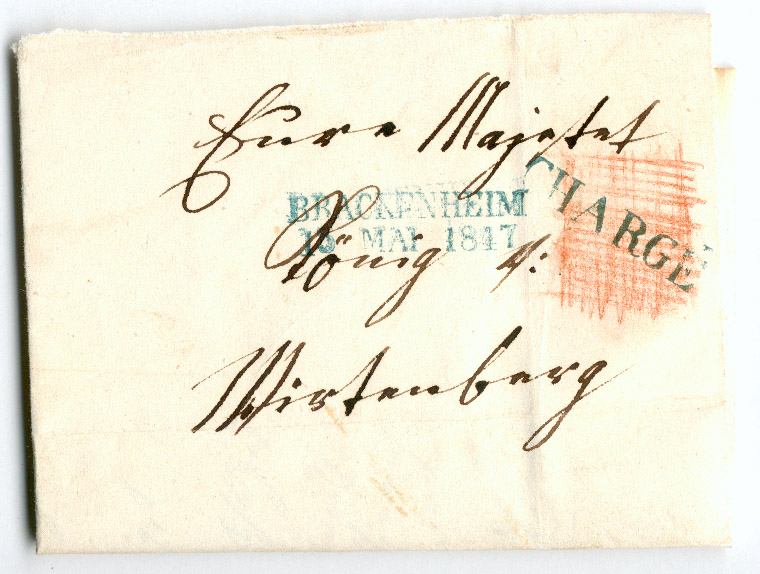 Der nächste Brief ist ebenfalls ein CHARGE Brief (zweseitig beschrieben) (ebenfalls ein Portobrief, ohne Portoangabe) von Brackenheim an König Wilhelm I. von Württemberg vom 13. Mai 1847. Hier ist am Siegel nichts zu erkennen (weggerissen). Auch hier ist keine CHARGE Nr. angegeben. Er ist von einer Person unterschrieben.