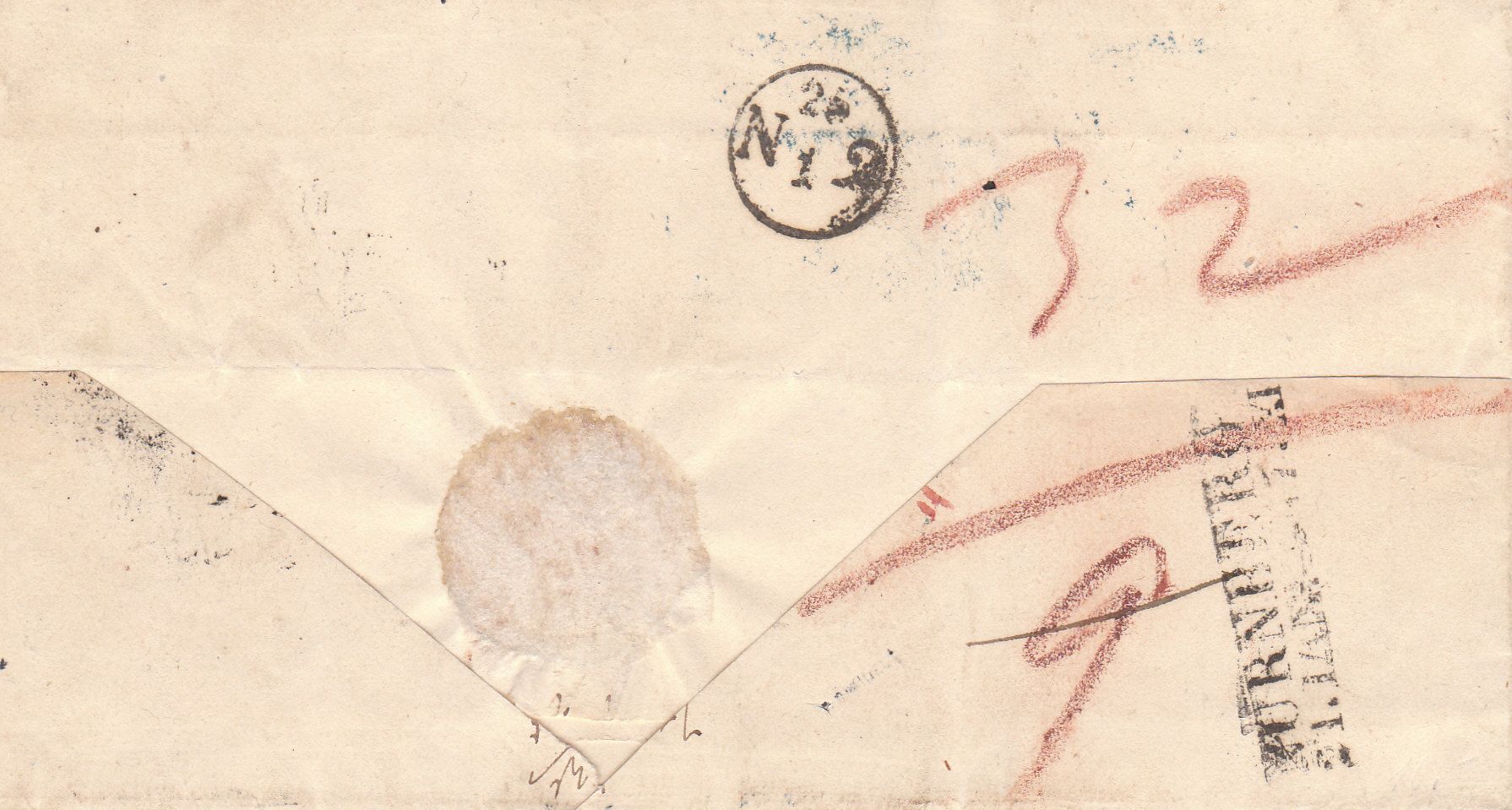 Ein Tag von Jochgrim nach Kandel und ein Tag von Kandel nach Lauterbourg macht 2 Tage, so dass er am 12.5.1851 als innerfranzösischer Portobrief dort aufgegeben wurde. Die französische Post wog ihn mit 11 1/2g (links oben) und taxierte ihn als Doppelbrief mit 5 Decimes nach dem innerfranzösischen Taxreglement. Am 13.5.1851 wurde er dem Bürgermeister in Strasbourg nach Zahlung ausgehändigt.