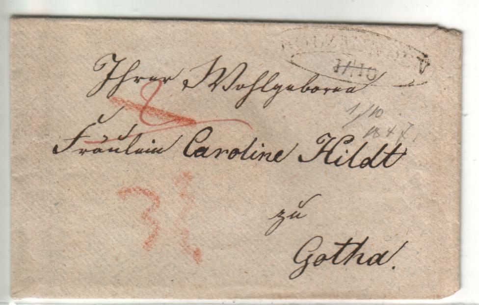 hier haben wir einen Auslandsbrief vor uns. Holzminden im Großherzogtum Braunschweig bis zur Grenze 2 Groschen, Grenze bis Zielort Gotha 1 3/4 Groschen. Jedes Postgebiet erforderte die Gebühr, die nach Entfernung und Gewicht durch Reglement festgesetzt war.