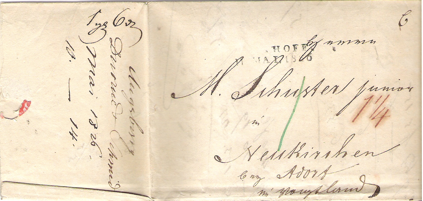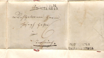 Hof fungierte als sächsisches Postamt und taxierte mit 1 Groschen, zu dem später noch die Botengebühr kam, so dass der Empfänger hinten mit 1 Groschen und 6 Pfennigen belastet wurde.