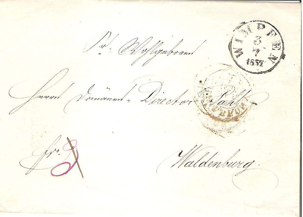 Der Brief aus Wimpfen ist mit 3 Kreuzern frankiert. Wimpfen, die hessische Exklave zwischen Baden und Württemberg lag nur wenige Kilometer entfernt von Heilbronn. Waldenburg liegt im Oberamt Öhringen ca. 5,5 Meilen von Wimpfen entfernt. Das Franko ist also richtig und der Postler wußte offensichtlich mit der Ortsbezeichnung etwas anzufangen, denn er nahm das naheliegendste Waldenburg an.