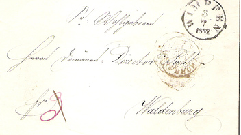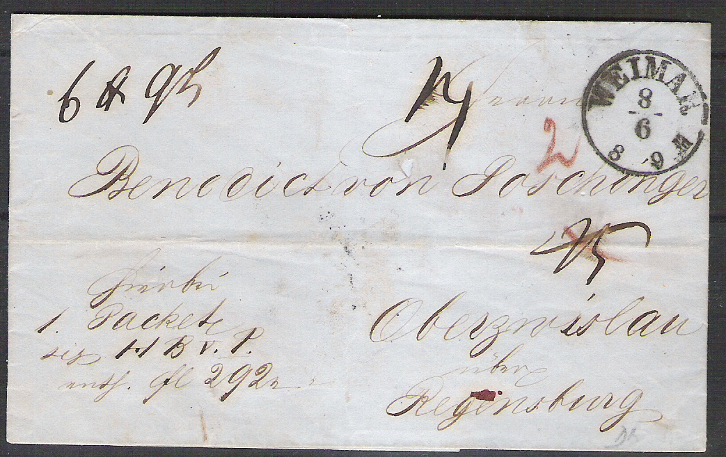 4) Nicht ungewöhnlich war bei den Taxis - Posten, dass man Briefe bar frankierte, wie das bei diesem aus Frankfurt/M. mit 9 Kr. über 20 Meilen unter 1 Loth Gewicht der Fall war. Da es keine Vorschriften zur Frankatur im Postverein gab (!), waren derlei Briefe auch nicht vorschriftswidrig. Jedes Land konnte selbst bestimmen, wie es die Frankatur bewerkstelligen wollte. Der DÖPV konnte da gar nichts vorschreiben. Barfrankaturen kenne ich auch aus Preußen, M - Strelitz und anderen Ländern, das macht die Briefe für mich aber nicht unattraktiv.