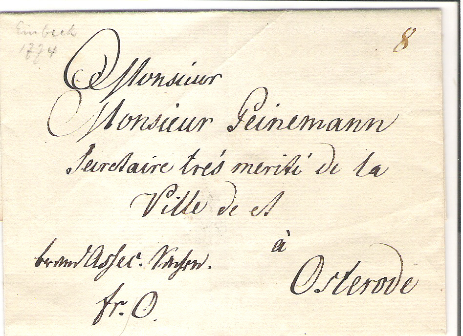 2) Eine brand Assec(uranz) Sache mit Franchise Franko 0, also portofrei, angeblich aus Einbeck von 1774 nach Osterode. Einen Hinweis auf Einbeck finde ich nicht - hier heisst es glauben, dass derjenige, der das Archiv in Osterode erleichtert hat, gewissenhaft vorging. Meistens sind diese Notationen aber korrekt.