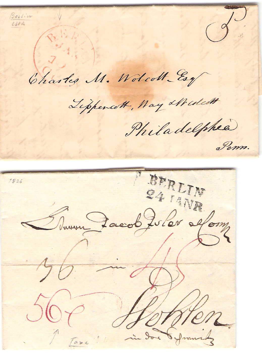 Links oben sehe ich etwas, das ich als 5C deuten könnte - das wäre ein mögliches Porto...um es genau sagen zu können, müßte man wissen, wie schwer der Brief war, aus welchem Berlin er kommt (es gibt Berlin in mehreren Staaten) und aus welcher Zeit er stammt.Bezügl. der Verwendeten Stempel ist das von mannaro gezeigte Handbuch von P. Feuser wohl Standard - aber über die Gebühren steht da nichts drin !
