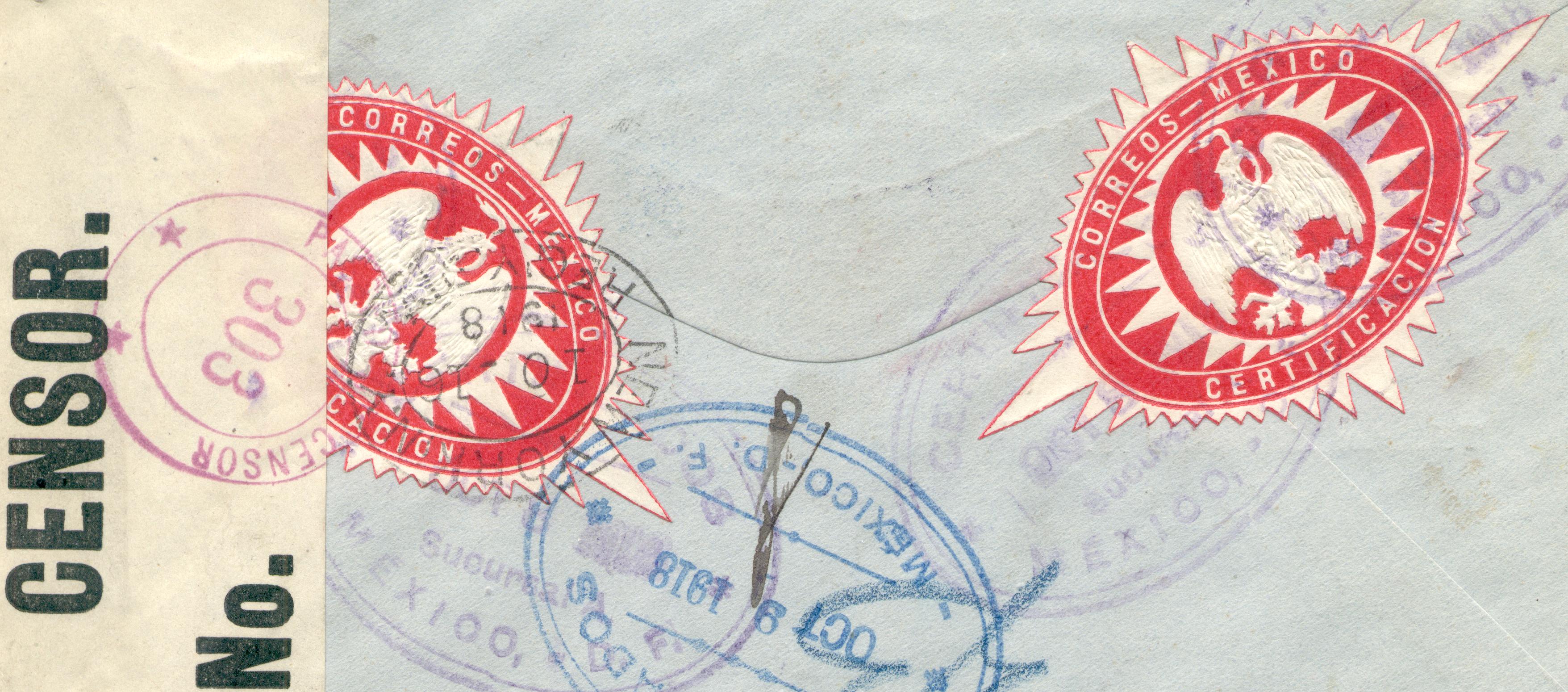 Zu mexikanischen Einschreibe-Siegelmarken kann ich weiss Gott auch nichts beitragen -- allerdings etwas, hoffe ich, zur amerikansichen Zivilzensur waehrend des ersten Weltkrieges.