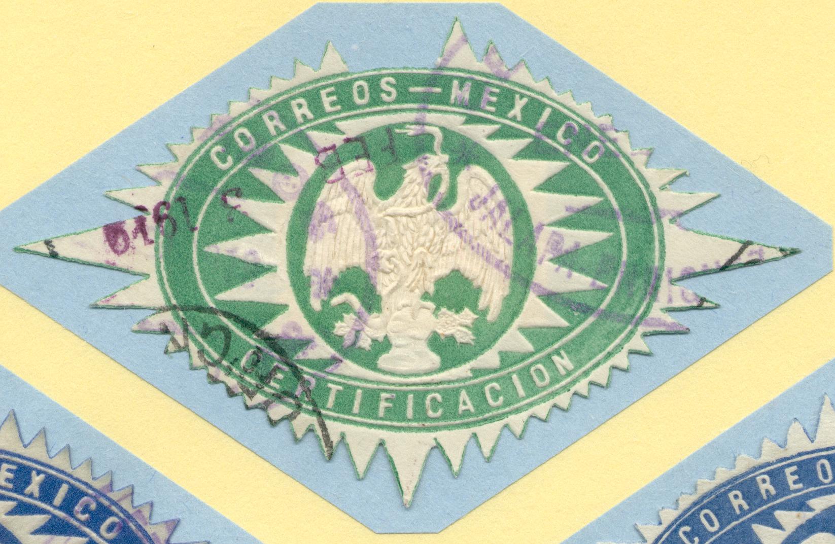 Im Jahre 1899 verfügte die mexikanische Postbehörde, dass eingeschriebene Briefe aus Sicherheitsgründen ein Siegel aus Wachs bzw. aus Siegellack auf der hinteren Briefklappe zu tragen haben.