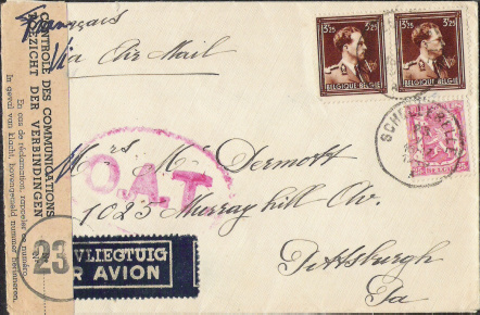 (Island - Färöer) Onward Air Transmission (=weiter mit Flugverbindung): Britischer Luftpost-Leitvermerk (1940/52) auf ziviler Post, der vermutlich nur auf dem oberen Poststück eines Briefbundes (deshalb die Seltenheit) nach erfolgter britischer Zensur angebracht wurde. Die Seewege um Groß Britannien waren im 2. Weltkrieg unterbrochen. Der Leitvermerk wurde in der Regel mit Gummistempel abgeschlagen aber seltener auch handschriftlich notiert. Die Anwendung erfolgte nicht nach den Regeln des internationalen Postverkehrs.