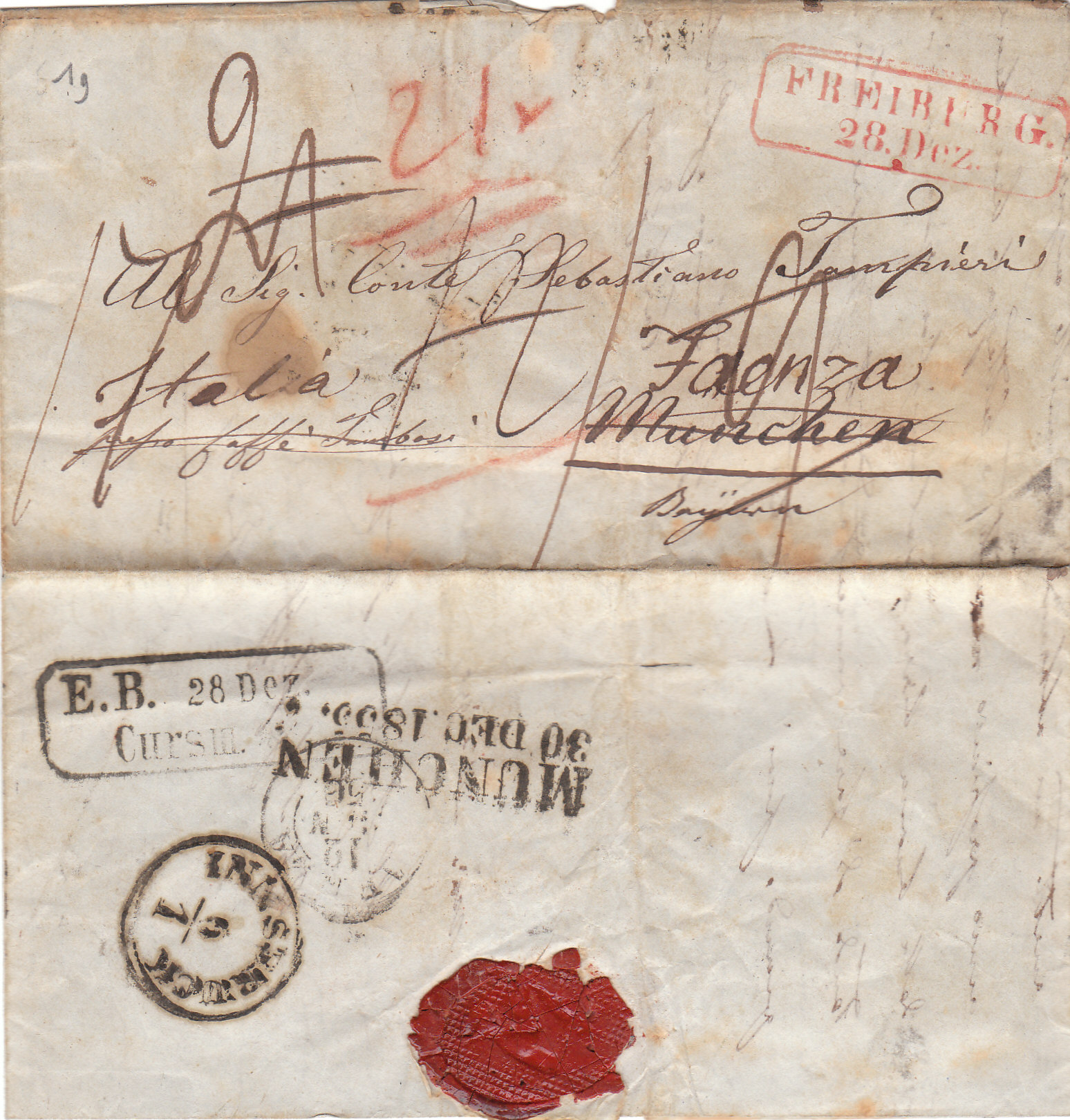 heute zeige ich einen Portobrief aus Freiburg vom 28.12.1855, der zuerst nach München gerichtet war. Von dort war der Empfänger aber nach Faenza abgereist, so dass man ihn nach dorthin senden musste.