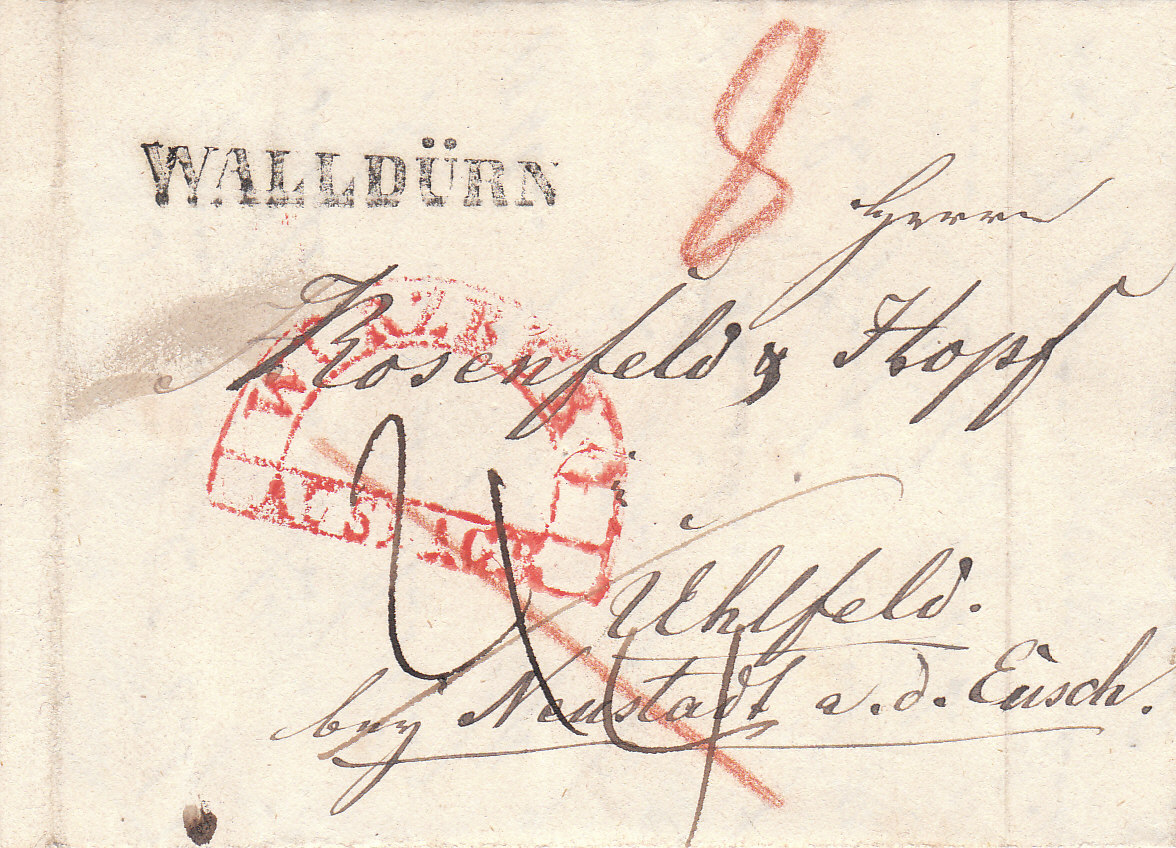 So war es korrekt, dass an der badischen Grenze die dortige Post neben "frco" noch in Rötel "Grz", also Grenze, vermerkte und bis zum Empfänger in Neckargemünd 10 Kr. Porto forderte.