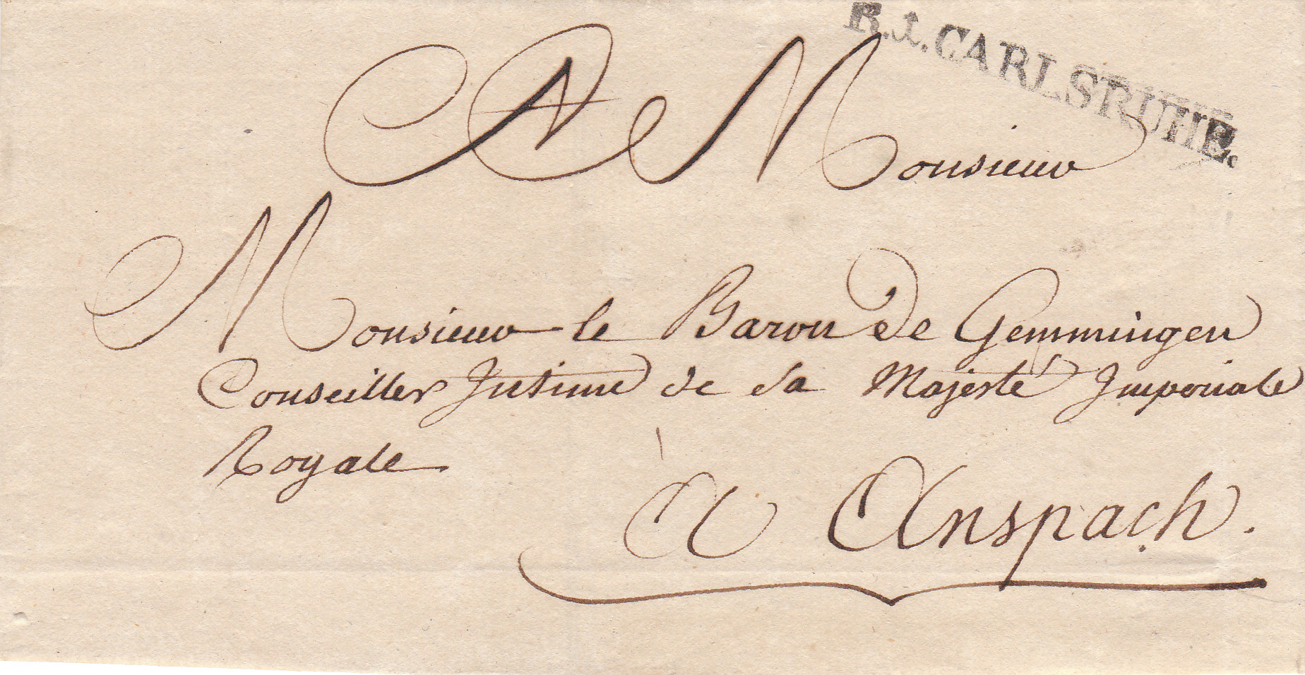 Der 1. Brief aus Karlsruhe vom 10.3.1811 war an den Baron von Gemmingen in Ansbach gerichtet. Der § 14A stellte fest, dass die Portofreiheiten nach den Gegebenheiten des großherzoglichen Erblandpostmeisters Thurn und Taxis anerkannt wurden, so dass die Herrscherhäuser mit ihren Ministern und Oberbeamten portofrei ihre Poststücke überlassen bekamen.