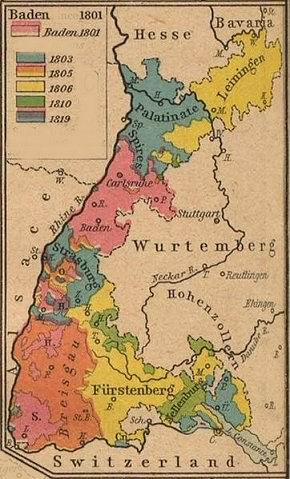 Baden das 1803 zum Kurfürstentum erhoben wird, gewinnt im Reichsdeputationshauptbeschluß, als Ausgleich für die 1796 an Frankreich abgetretenen linksrheinischen Gebiete das Hochstift Konstanz, die rechtsrheinischen Gebiete der Hochstift Basel, Speyer und Straßburg sowie der Reichsstifte Petershausen und zum Teil Salem, die Herrschaft, die Reichsstäde Überlingen, Pfullendorf, Gengenbach, Biberach, Wimpfen, Offenburg und Zell a.H. sa,t zugehöriger Gebiete, die bisher zu Hessen gehörenden Ämter Lichtenau und Willstätt, die Güter der Abteien Schwazach, Lichtental und Frauenalb sowie vieler anderer Klöster und nicht zuletzt die kurpfälzischen Ämter Heidelber, Bretten und Ladenburg mit den Städten Heidelberg und Mannheim.