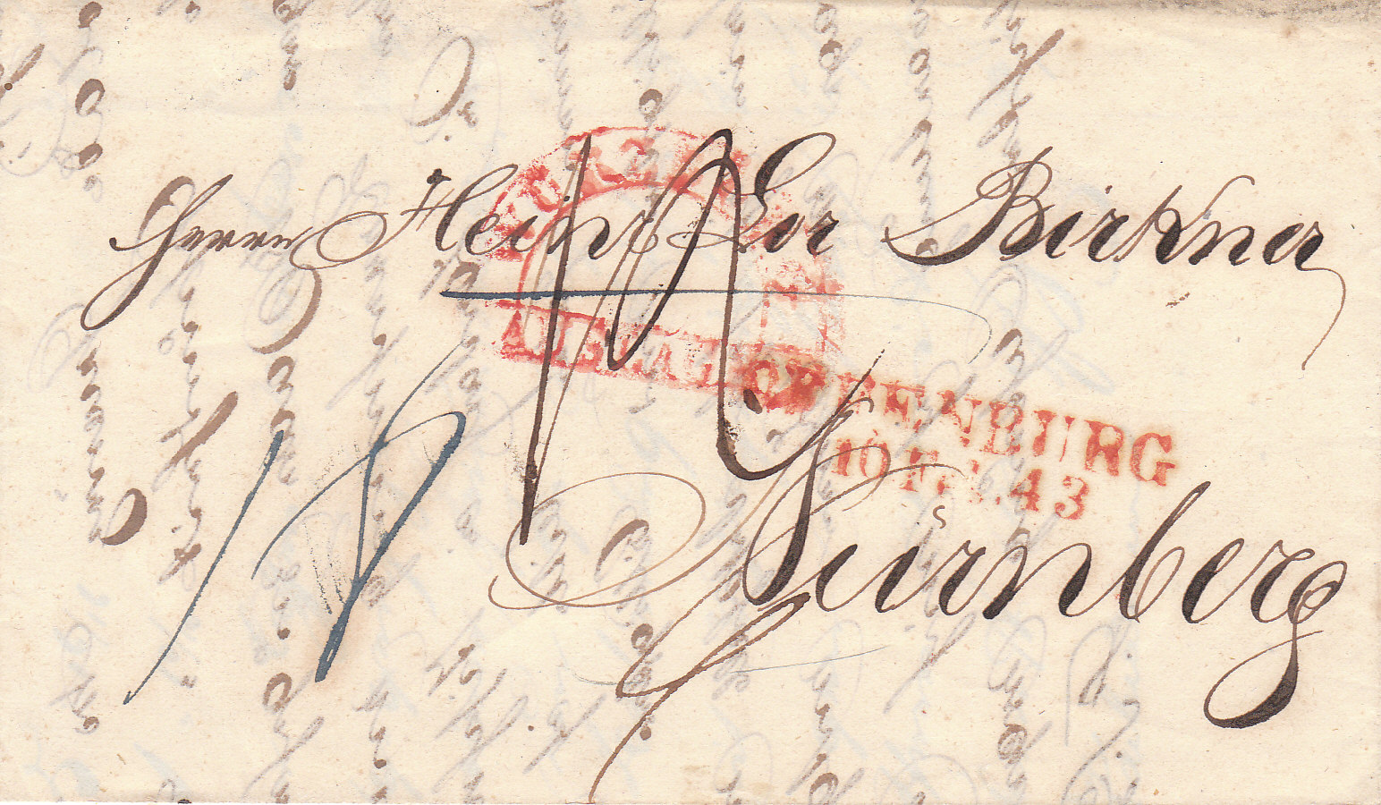 1) Brief aus Freiburg vom 23.3.1847 nach München. In Augsburg wurden 12 Kr. in Auslage genommen, die in München 3 Tage später kassiert wurden. Mit der Generalrechnung vom 31.3. wurde Baden die Hälfte überwiesen.