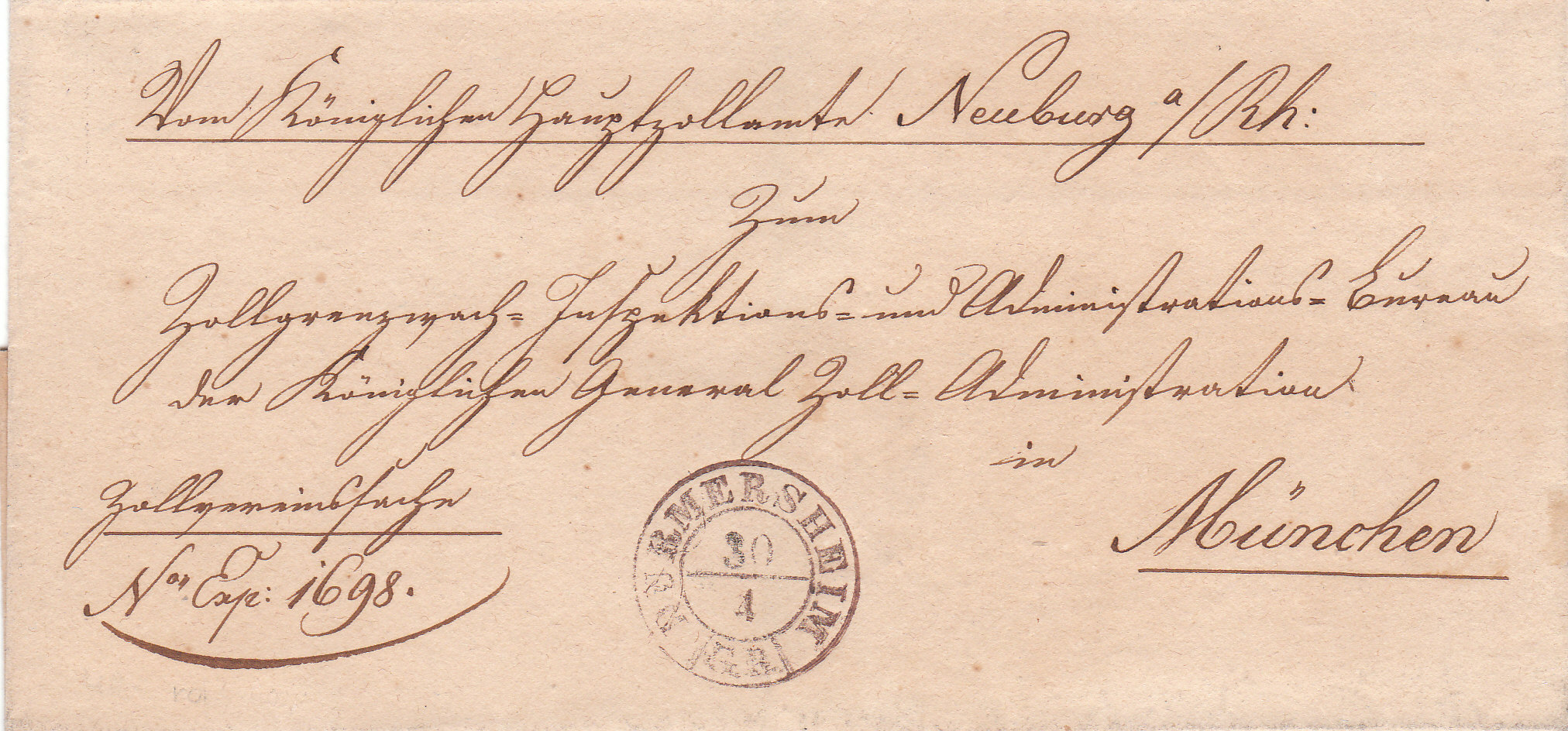 2) Brief des bayer. Hauptzollamts in Neuburg am Rhein nach München vom 30.4.1844. Da Neuburg keine eigene Post hatte, brachte man den Brief über den Rhein mit einem Flößer nach Durmersheim und gab ihn dort auf. Dort hatte man keine Probleme damit und spedierte ihn gratis weiter nach München. Nur 2 Briefe sind bisher derart behandelt bekannt geworden (hätte ein Düsseldorfer Auktionator nicht gepennt, hätte ich den 2. auch noch!).