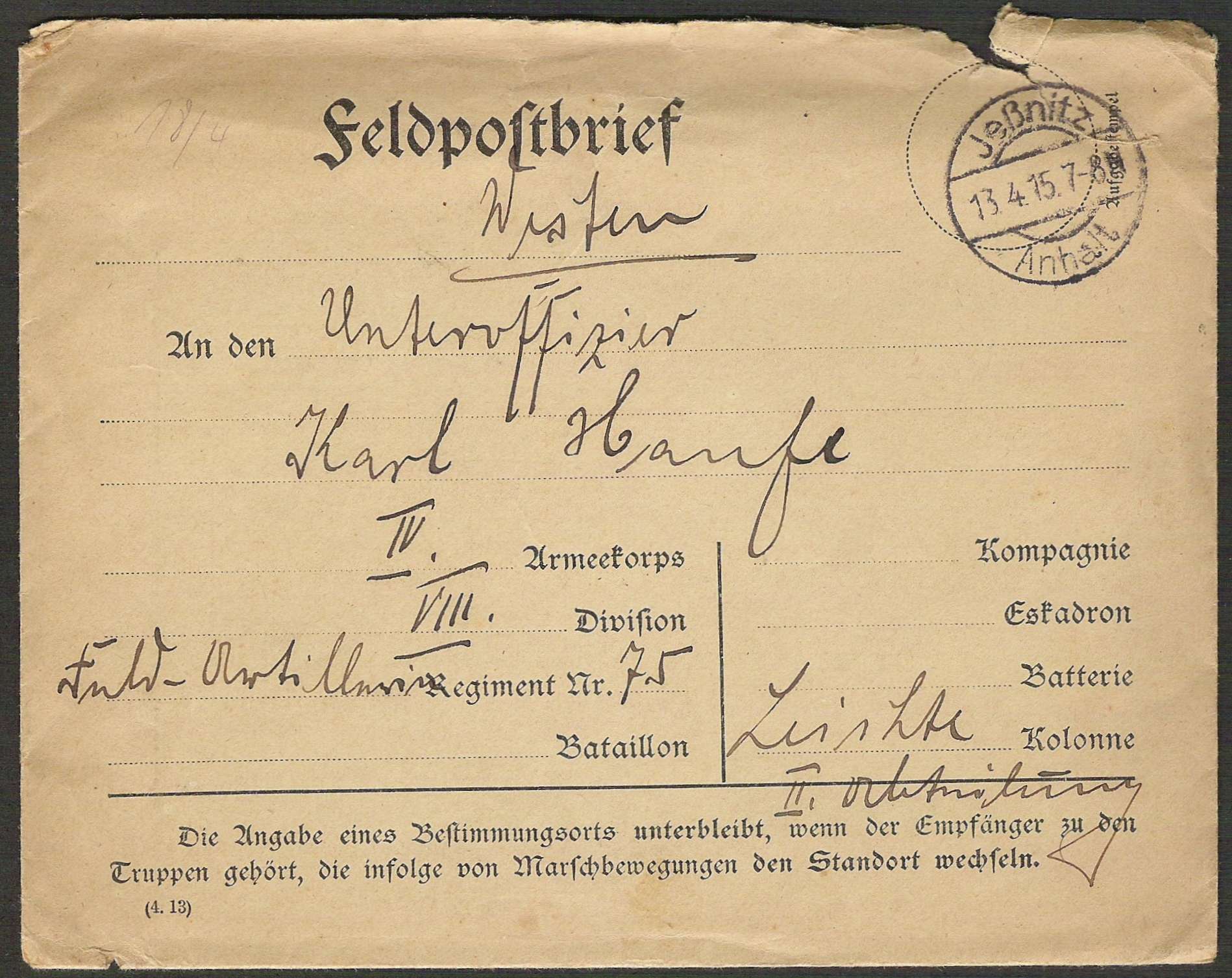 Einen etwas ramponierten Feldpostbrief mit Stempel von Jeßnitz habe ich auch noch gefunden.