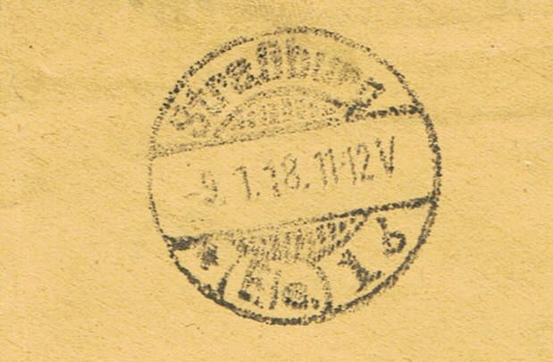 Straßburg (Els.) *1b vom 09.01.18 als Ankunftstempel. Es überrascht doch etwas, einen Stempel mit Gittersegmenten so spät in Straßburg noch zu finden, denn eigentlich waren da die Nachfolgestempel teilweise schon ganz schön verhunzt.