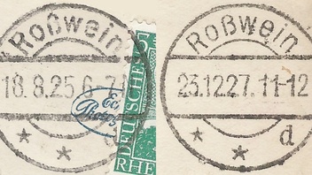 Auf den ersten Blick zwei gleiche Stempel,doch bei näherem hinsehen ist der von 1925 ein 12-Stundenstempel und der von 1927 ein 24-Stundenstempel.Kleinere Unterschiede giebt es auch noch bei der Schreibweise von Roßwein.