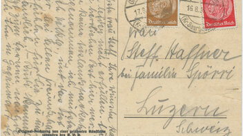 auf Postkarte nach Luzern in die Schweiz vom... ja von wann denn? Die 12 Pfg. Marke wurde am 16.8.1936 entwertet, da wurde wohl festgestellt das das Porto nicht ausreicht und es wurden am 17.8.1936 weitere 3 Pfennig zufrankiert um das Porto kpl. zu machen.