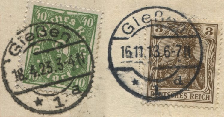 Der Gießen Stempel ist meines Erachtens ein d. Hier mal noch ein größerer Scan vom Stempel. Hatte den mit einem d-Stempel bei Stampsx (siehe Scan 2) verglichen und das schien mir plausibel. Hättest du mal ein a zum Vergleich.