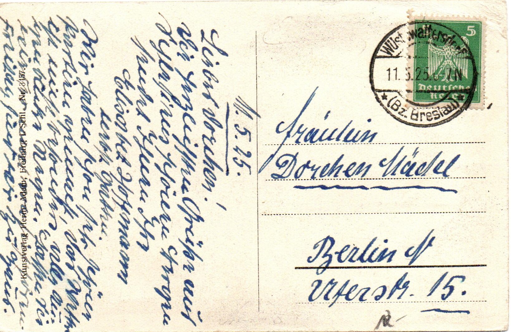 ein Neuzugang für meine Heimatsammlung Wüstewaltersdorf. Der Kleinschriftstempel Wüstewalteresdorf (Bz. Breslau) vom 11.5.25. Vom Stempeldatum nichts besonderes. Nach meinem Kenntnisstand ist die verwendung dieses Kleinschriftstempels vom 1.5.1915 bis 19.7.1927 bekannt. Das aktuelle Letztdatum ist dank webpirate in meinem thread "Wüstewaltersdorf" unter Heimatsammlungen zu sehen.