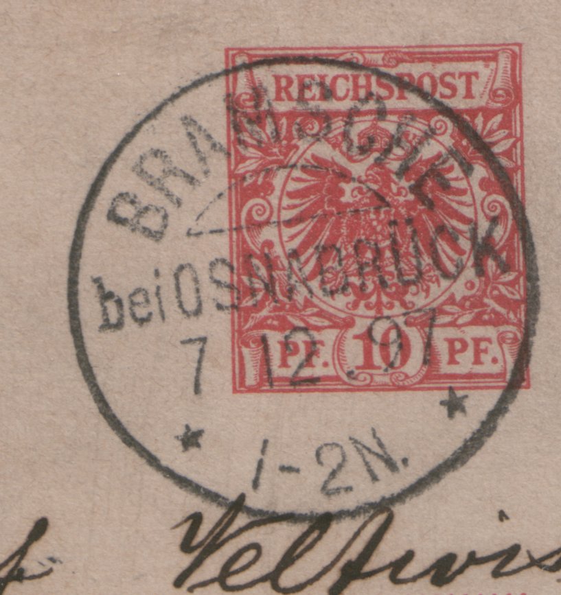 Der Bramsche ist ein interessanter Stempel. Ich erfasse ihn, obwohl er nicht auf Germania ist. Aber er ist bisher von 1891 bis 1910 (und damit auch auf Germania möglich) bekannt.