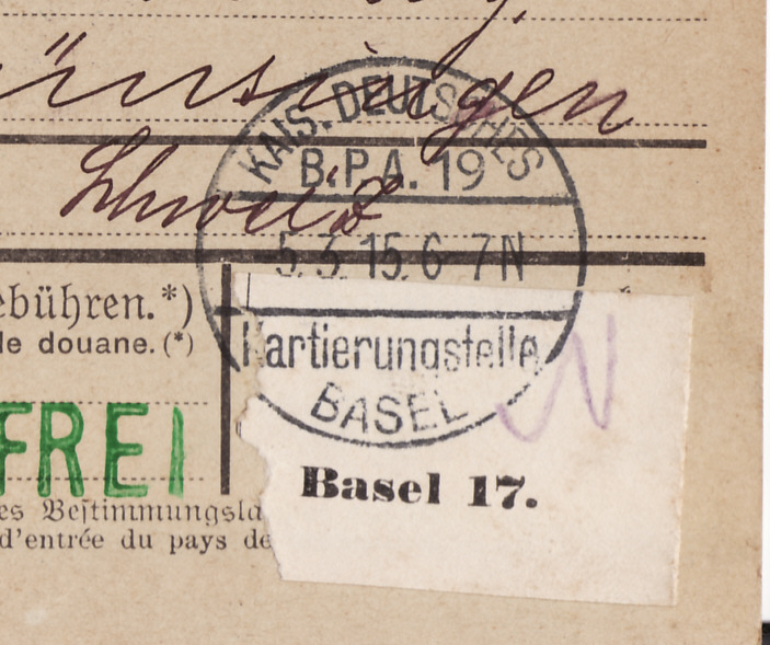 KAIS. DEUTSCHES B.P.A. 19 Kartierungsstelle BASEL vom 05.03.1915 auf einer Paketkarte.