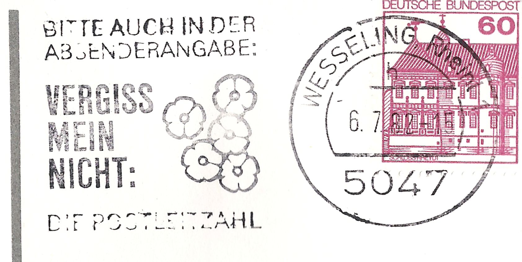 Aus dem Berich der guten alten Bundespost, wo alles doch wahrscheinlich irgendwie vorgeschrieben war für mich eine Neuentdeckung: den Maschinenstempel WESSELING, Rheinl 1 h , wobei der Handstempel WESSELING 1 c ohne "Rheinland" auftritt.