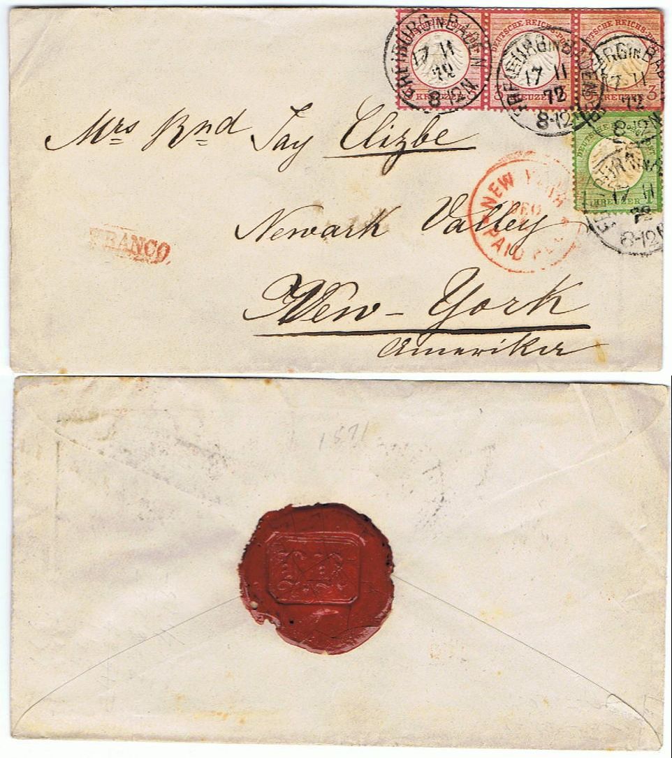ich geh mal davon aus, das der brief in einem geschlossenen paket (mit anderen briefen aus deutschland) nach new york befördert wurde, und dort den stempel bekommen hat, daher kein transitstempel aus hamburg, bremen oder london...